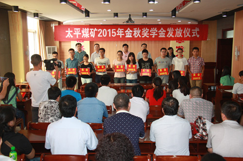 8月28日,太平煤矿2015年度"金秋奖学"金发放仪式在行政办公楼六楼会议室隆重举行。矿纪委书记、工会主席邵作胜出席仪式并作重要讲话,这标志着我矿2015年度"金秋奖学"活动圆满落幕。此次活动共为2015年考入华中科技大学、中国人民公安大学、南昌大学、郑州大学等高校的36名职工子女发放奖学金91000元,为职工子女喜圆大学梦助力,在全矿上下引起强烈反响,受到职工家属普遍好评,擦亮了"金秋奖学"这一工会保障工作的靓丽品牌,进一步激发了广大职工敬业奉献的积极性,为保安增效、度危求进传递了正能量。