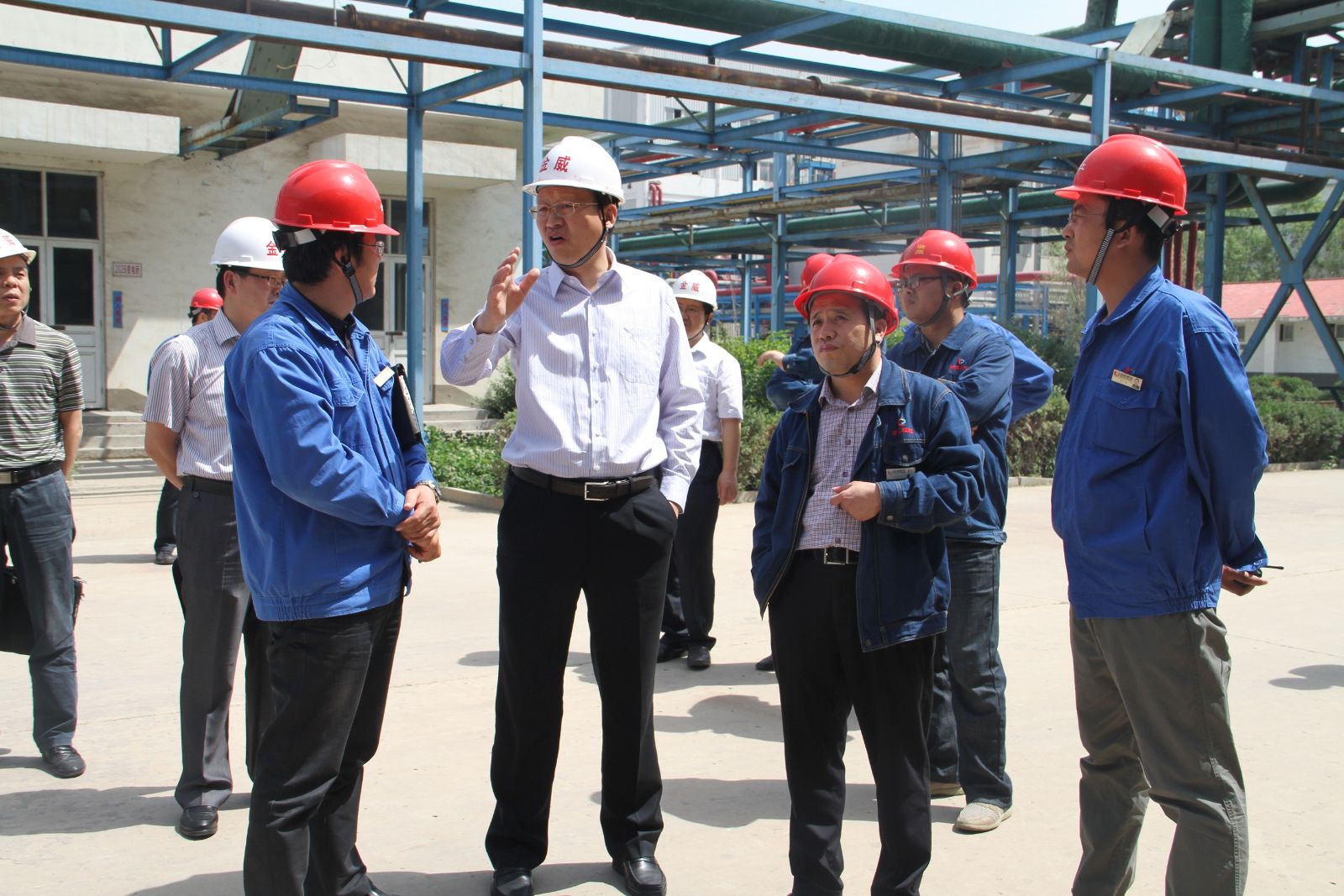 到达金威煤电后,李合军先到化工分公司调度室,了解了监控系统安装及运行情况,并叮嘱有关人员要提高监测监控的效果和质量,确保发挥作用。在包装车间,李合军查看了聚氯乙烯装运情况,就扩大聚氯乙烯存放地点作出明确指示。转化器、合成炉运行情况一直是李合军牵挂的重点。他来到设备运行区,听取了设备运行情况的汇报,就提高设备运行效果,提出建设性建议。原材料供应问题,也是此次调研的重点,他来到电石破碎车间,询问了工作流程、除尘情况,现场查看了电石质量。