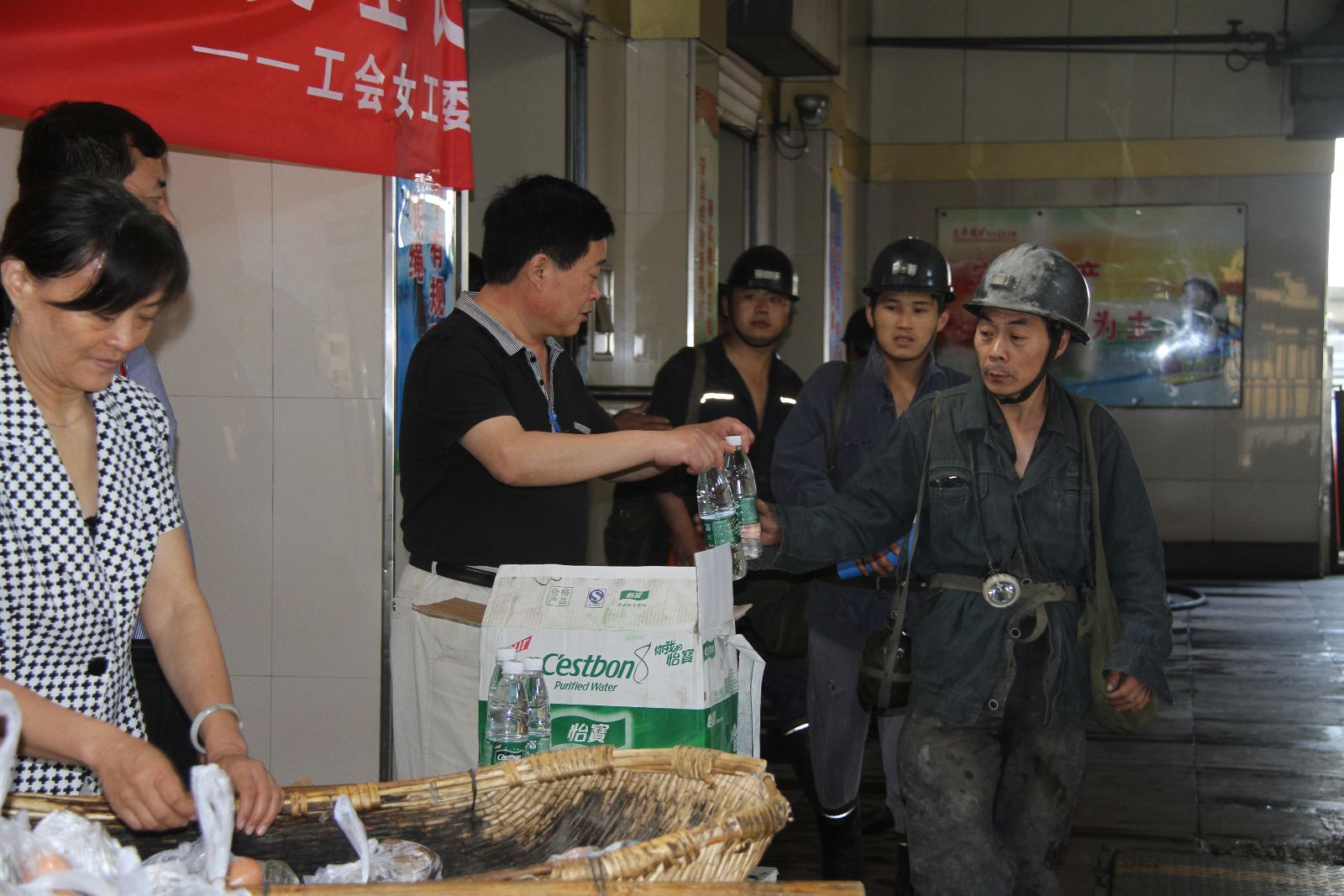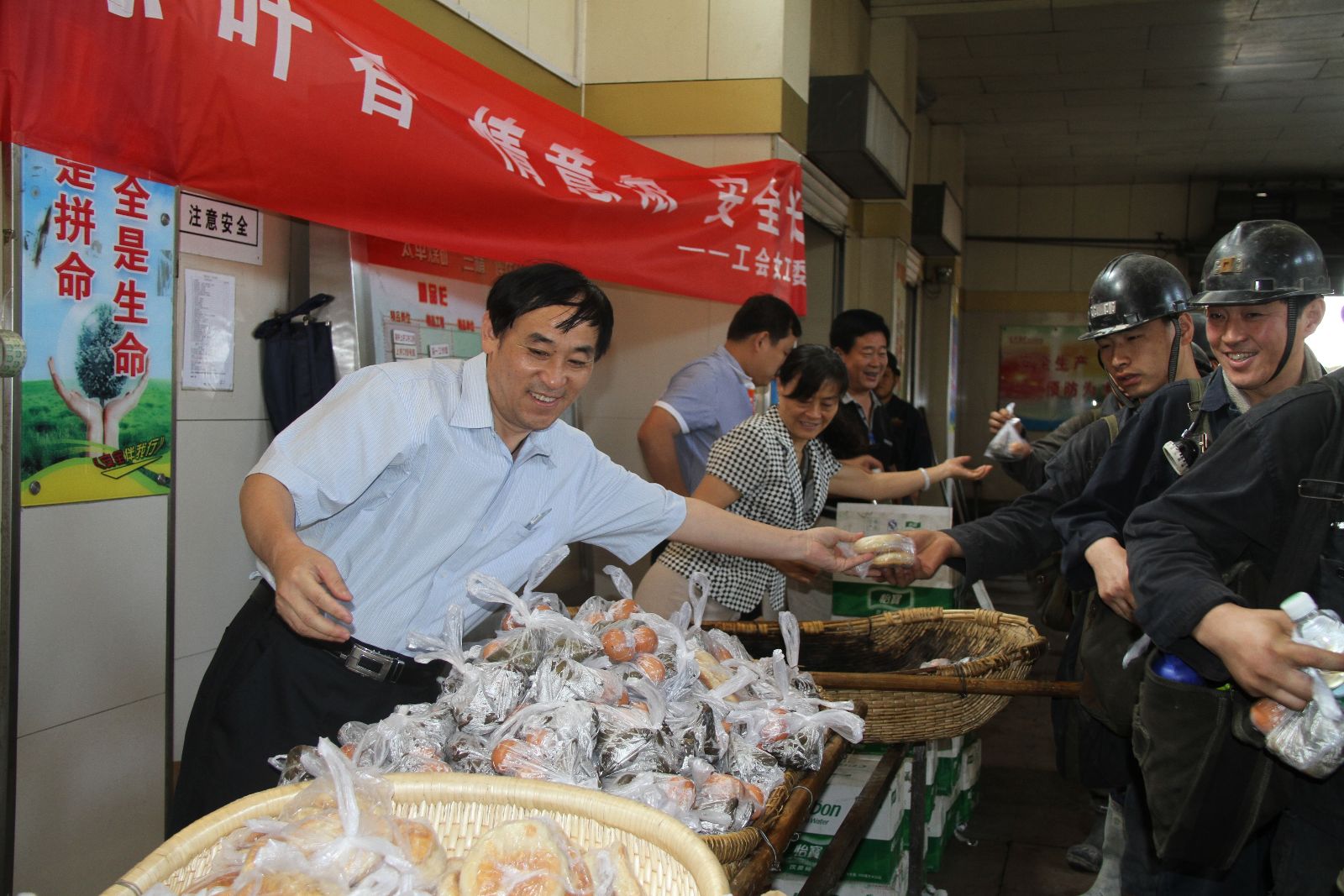 活动现场送礼品的除女工协管员外同时还有该矿党委书记汤保民、纪委书记兼工会主席邵作胜同志。他们和女工协管员一样,亲自站在井口,一边说着"师傅辛苦了,祝您节日快乐,上班时注意安全"等亲切的嘱咐话语,一边双手把一份份包裹着祝福的"爱心粽子"、热乎乎的鸡蛋、葱花油饼、矿泉水送到节日期间坚守岗位的矿工兄弟手上,送去了端午节最温暖的问候和诚挚的祝福。让广大矿工感受到了节日的温馨和领导的亲切关怀。矿工兄弟吃着香甜的粽子,脸上洋溢着幸福的笑容,温暖传到了心中,纷纷表示一定要时刻牢记安全,遵章作业,决不麻痹大意,不辜负矿领导的期望和关爱,为矿井安全生产再做新贡献。