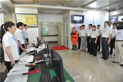 上午8时,演练正式开始。值班调度员接到8305工作面顶板出现溃水溃砂事故,危及井下现场人员安全,另受持续降雨影响,泗河水位上涨,泗河泄洪水位将超过警戒水位,威胁矿井安全的报告后,立即按"煤矿调度员十项应急处置权"下达停产撤人指令,并利用群呼系统和语音广播系统3分钟内通知到井下各作业地点人员沿避水灾路线撤人。