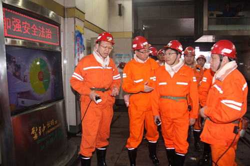 周凤文首先实地察看了太平煤矿调度指挥中心,通过监控系统查看矿井运转情况,检查领导干部值班带班及当班下井人员情况,询问矿井生产能力、执行276个工作日制度等情况。通过矿用小灵通与井下带班管理人员通话交流,询问现场安全生产情况,向奋战在一线的煤矿工人送去市政府领导的亲切关怀,要求他们要切实做好安全生产各项工作。