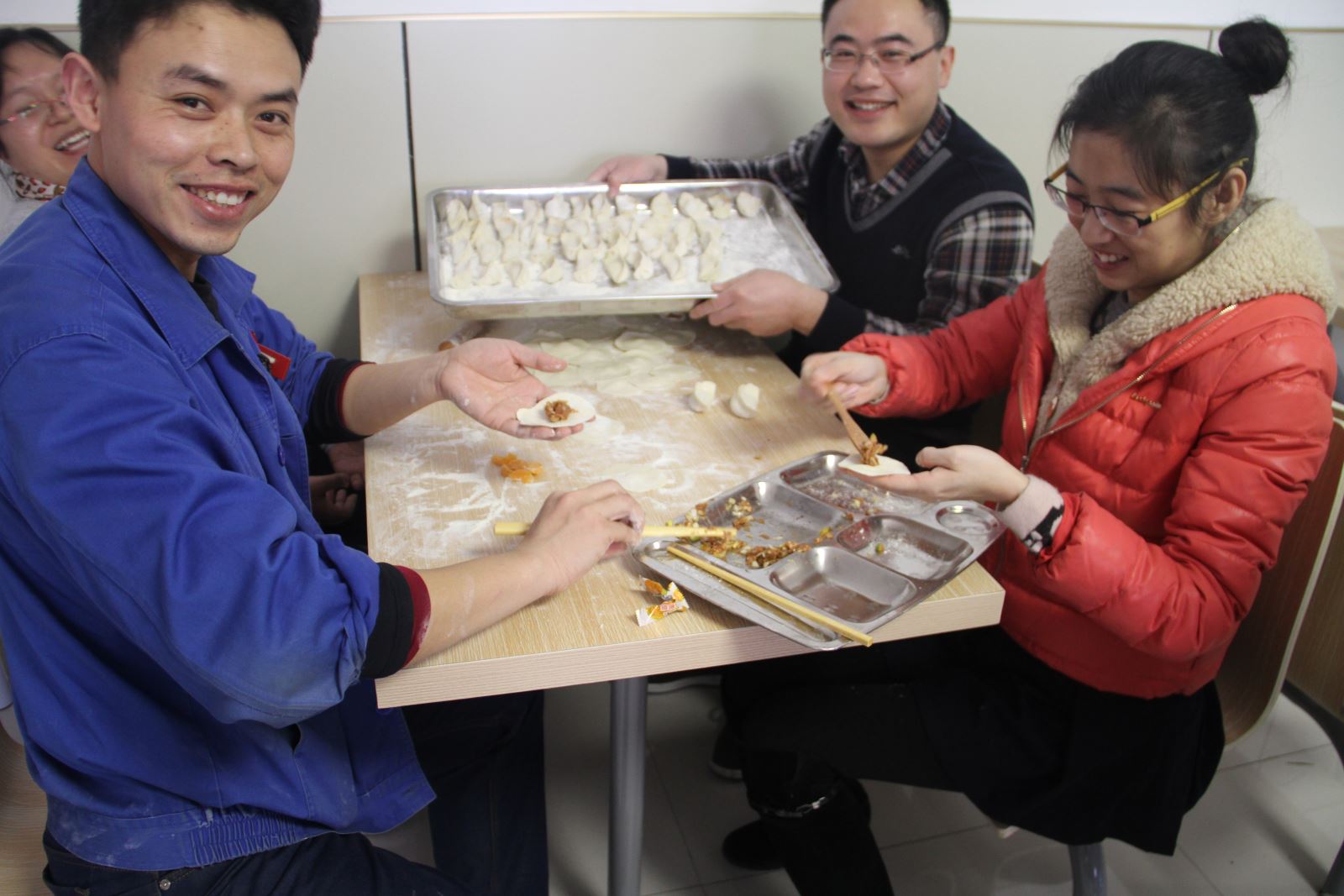 好吃不过饺子,温暖不过集体。为营造新春节庆氛围,感谢员工在工作中的辛勤付出,为那些在假日里坚守岗位的员工送上真切的关怀,让各位员工感受到节日的温暖,2月16日金威煤电公司团委组织各单位青年员工40余人齐聚一堂,开展"2015迎新春吃饺子一家亲"活动。
